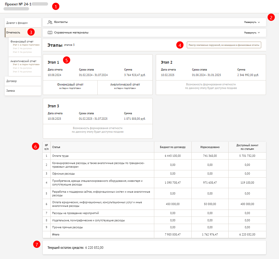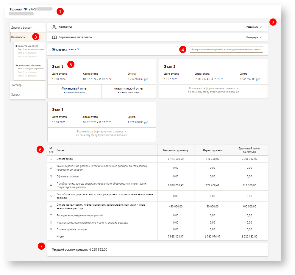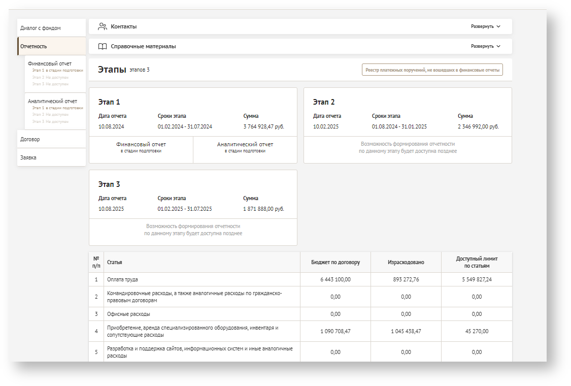 - Строка с количеством этапов и кнопкой для перехода в "Реестр платежных поручений, не вошедших в финансовые отчеты";