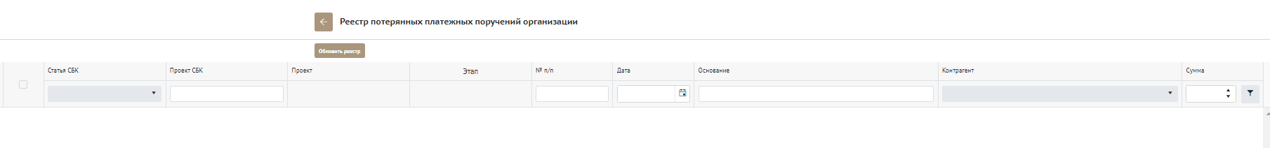 В реестре потерянных платёжных поручений организации отображаются платёжки не прикрепившиеся по каким-то причинам к проектам.
