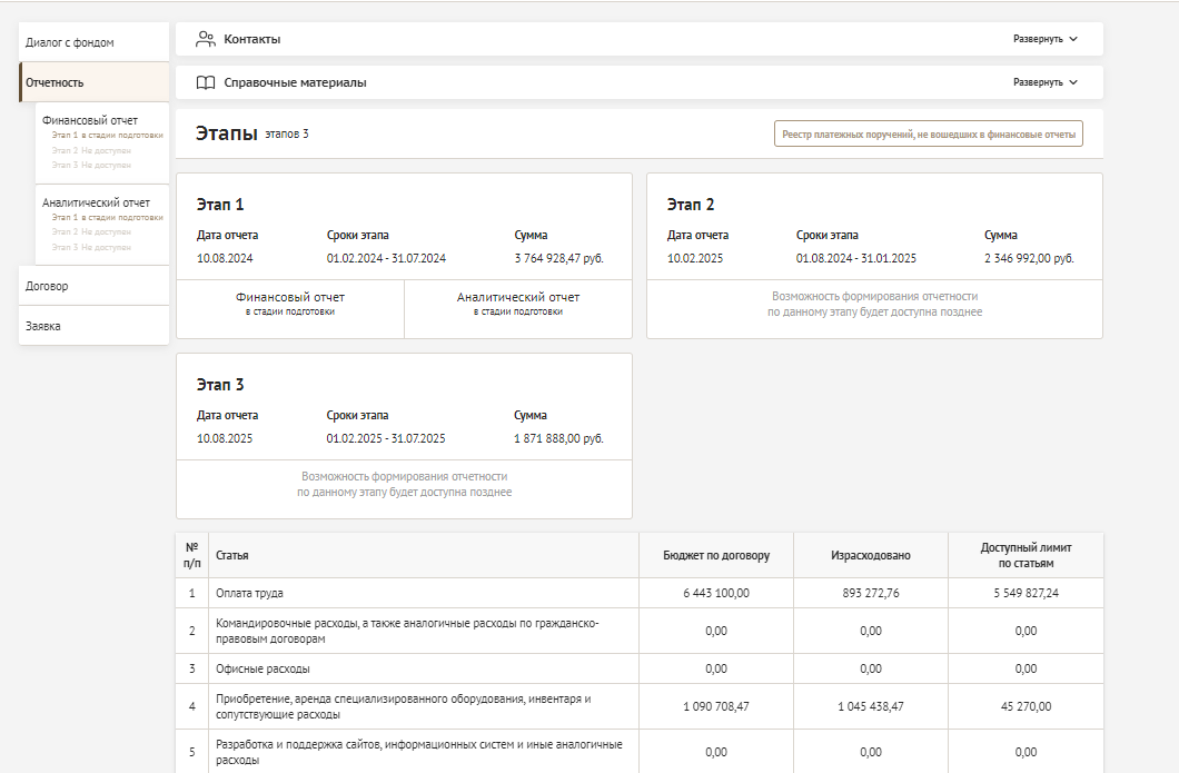 - Виджет "Контакты" с контактами автора заявки, куратора проекта и финансового сотрудника. И виджет "Справочная информация", содержащий справочные материалы;